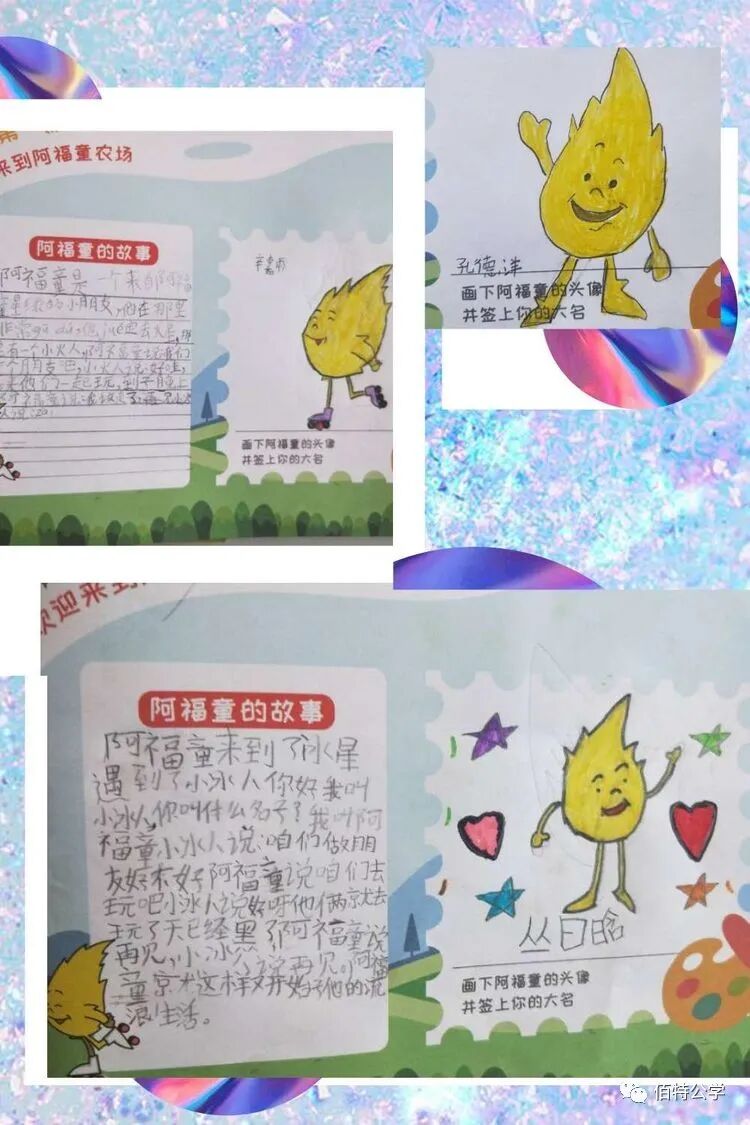 等等,这么有趣的事情怎么能不和家长分享呢!我们的课后活动就是把自己创编的阿福童流浪故事讲给家人听!瞧!第二节课前同学们把更奇特的流浪故事,和同学老师一起分享!